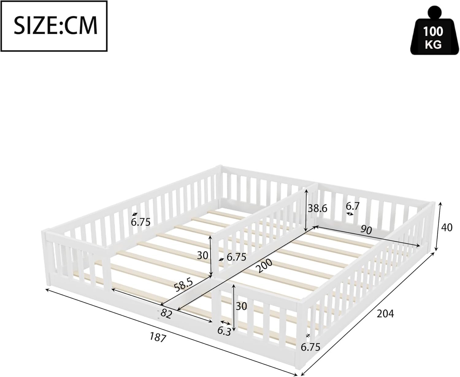 Upgrade your kids’ bedroom with our Children’s Twin Bed with Slatted Frame, thoughtfully designed for families with two children. This spacious floor bed fits two 90×200 cm mattresses side by side, making it ideal for siblings or sleepovers. The elegant white finish and minimalist design blend seamlessly with any décor, while the sturdy wooden frame ensures long-lasting durability.