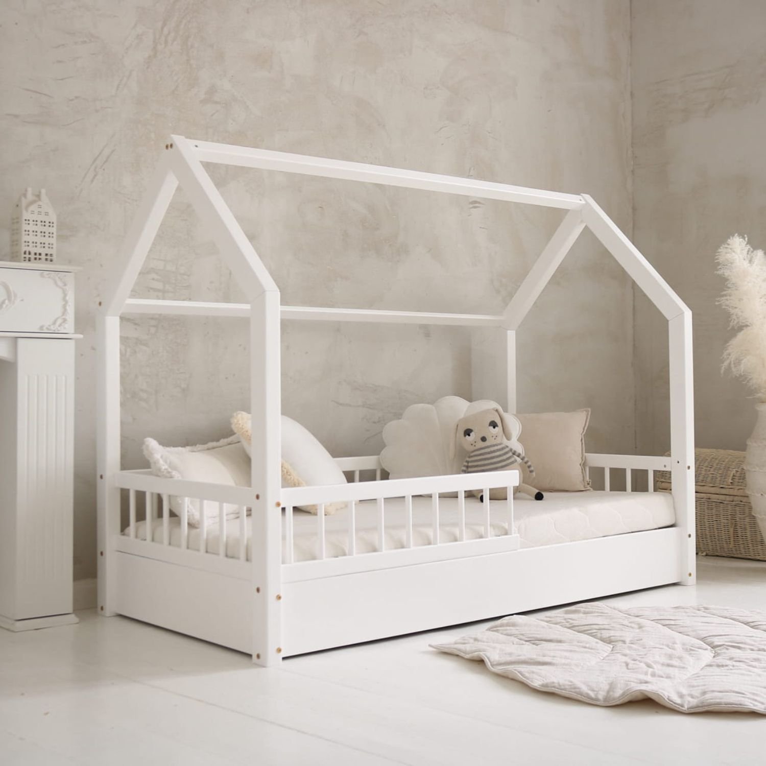 Transform your child’s bedroom into a cozy and secure retreat with our Montessori White Cottage Bed. Crafted from high-quality materials and finished in a timeless white, this bed is designed for a mattress and features thoughtful safety details and elegant cottage charm. The low-to-the-ground design encourages independence, while the protective rails offer peace of mind for parents.