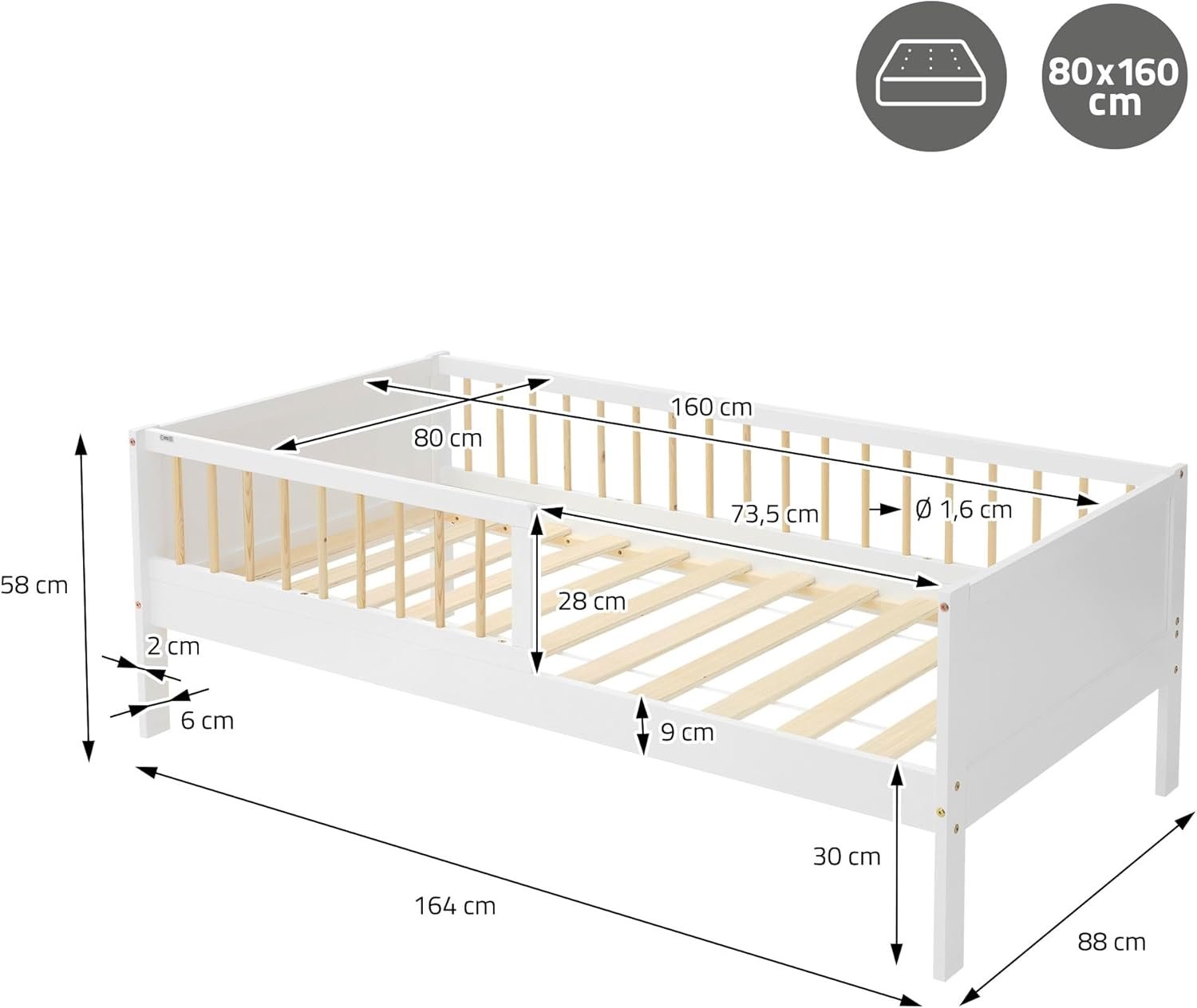 • Mattress size: 80x160cm (mattress not included)